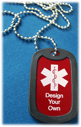 Our medical identification tags are $6.95 and can be custom designed or choose one from the many stock designs. Each of our bright red identification tags includes engraving on both the front and back, a 30” silver colored beaded necklace chain, and a silencer in your choice of (2) different colors --- Red or Black.